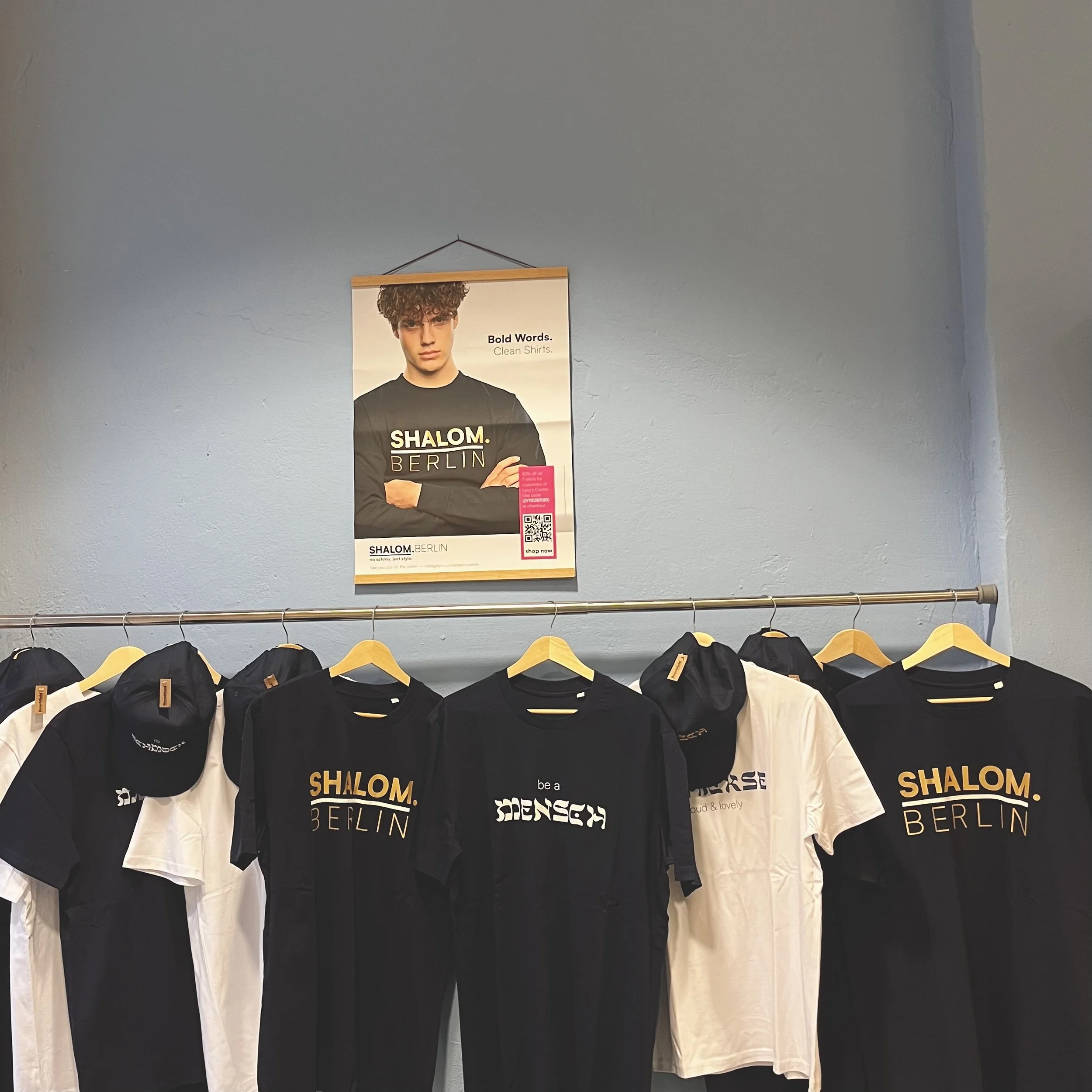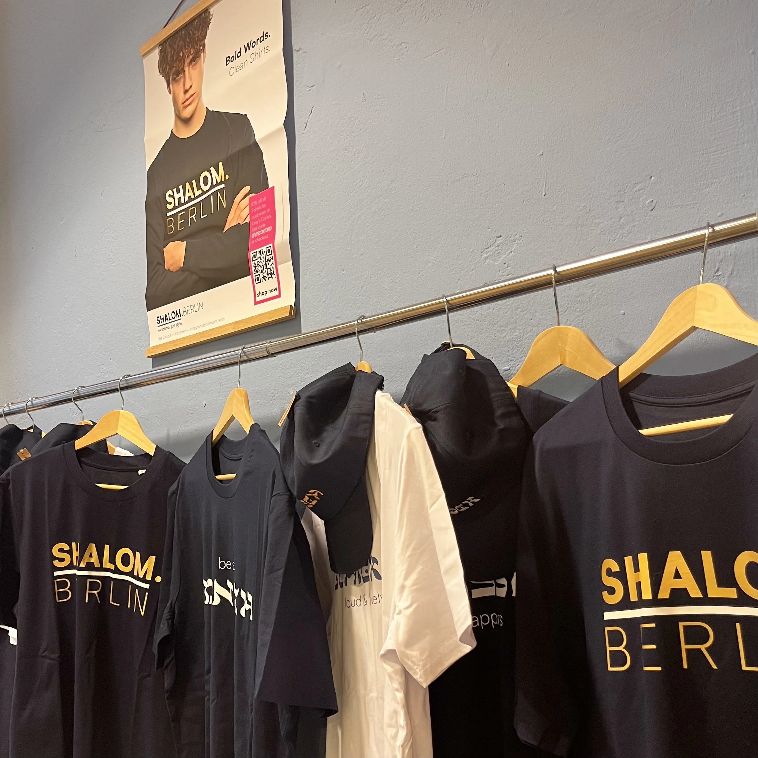 A curated selection of our T-shirts and our two caps are available at Levy’s Contor – presented on a dedicated SHALOM.BERLIN wall.