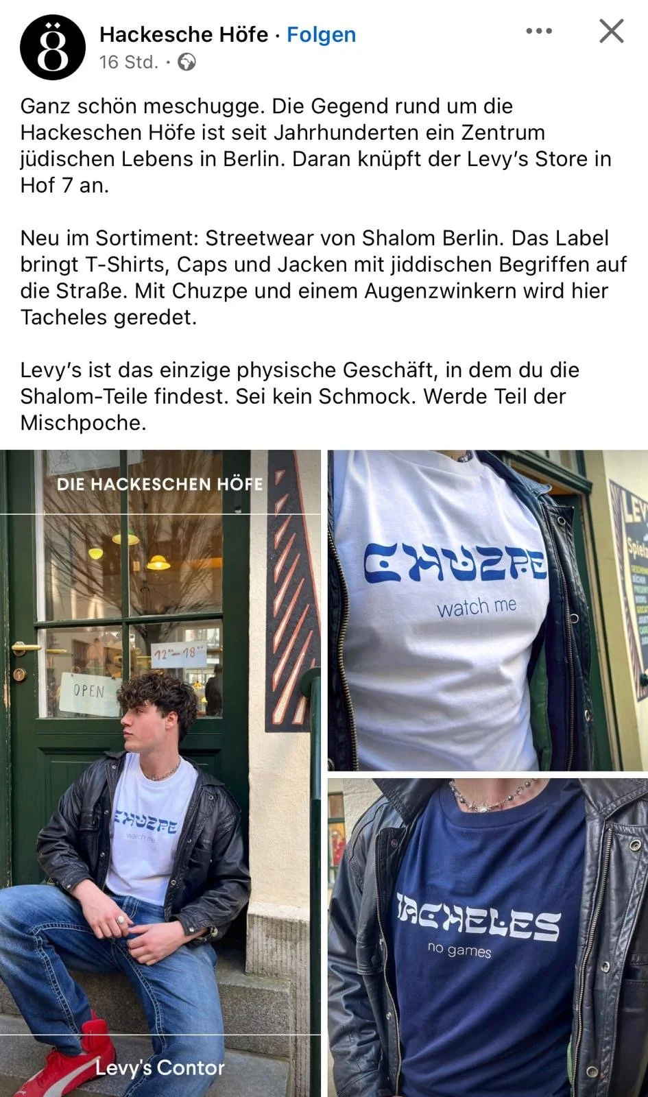 SHALOM.BERLIN has arrived at Levy’s Contor in Hof 7 – bringing bold T-shirts, caps and jackets with Yiddish attitude to the streets. It’s about language, culture, and a wink of irony. A little chutzpah. A little truth. Straight talk.